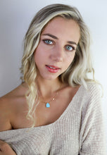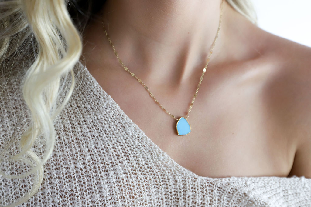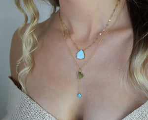 Genuine raw turquoise stone with gold edges is combined with a shimmering 14k gold filled chain. These natural gemstones vary slightly in the shape and size and not two are exactly alike.